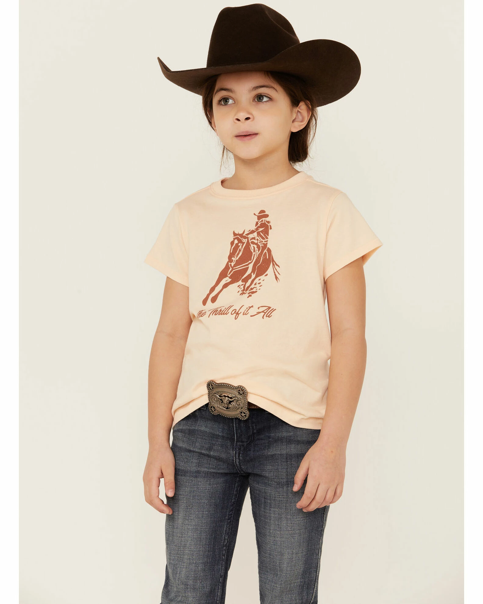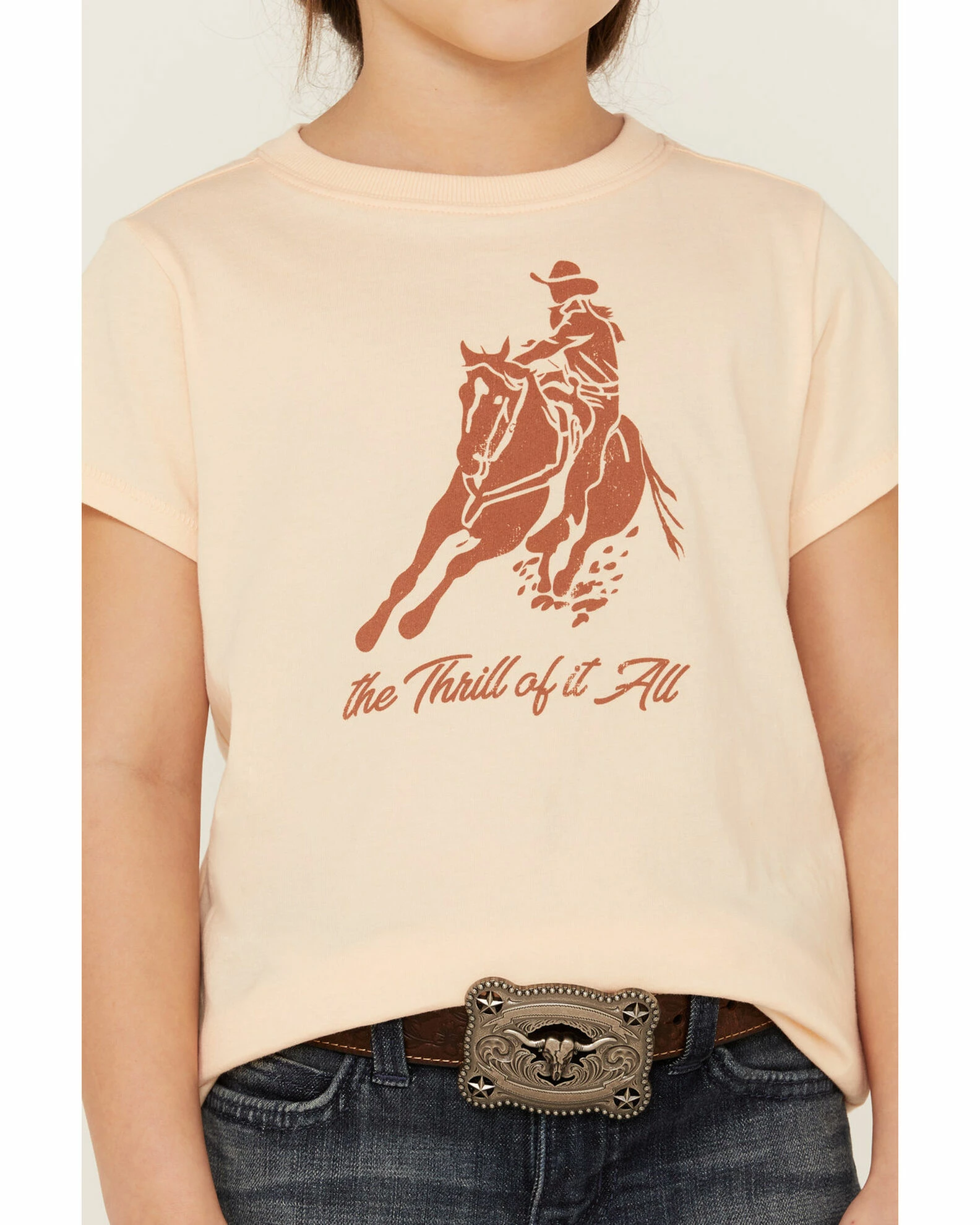 - “The Thrill of it All” and bronc riding graphic print on front