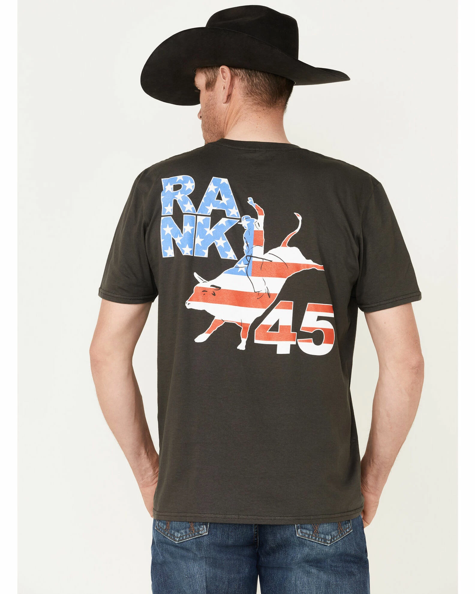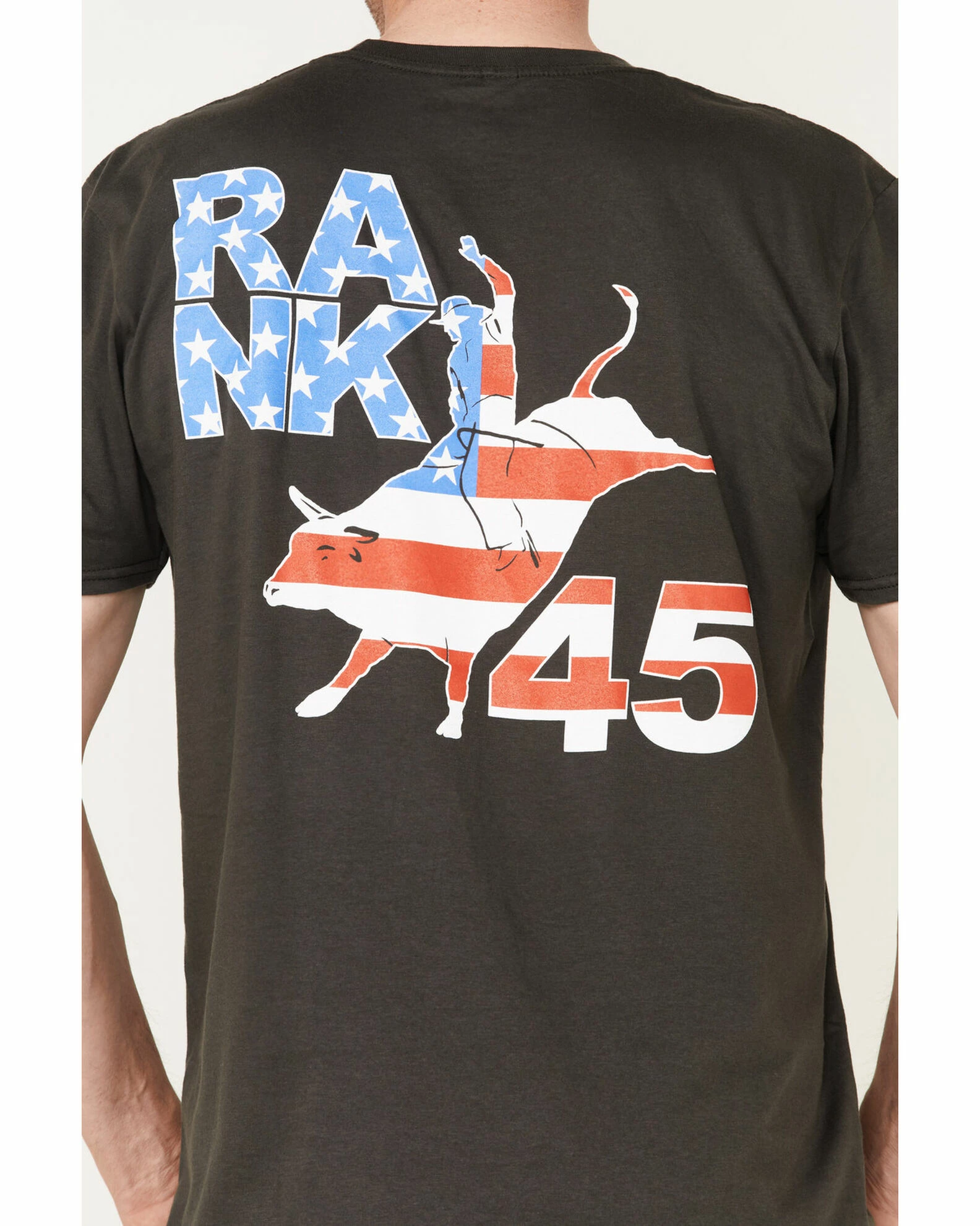 - “Rank 45” with stars and stripes printed rider and bull graphic on back