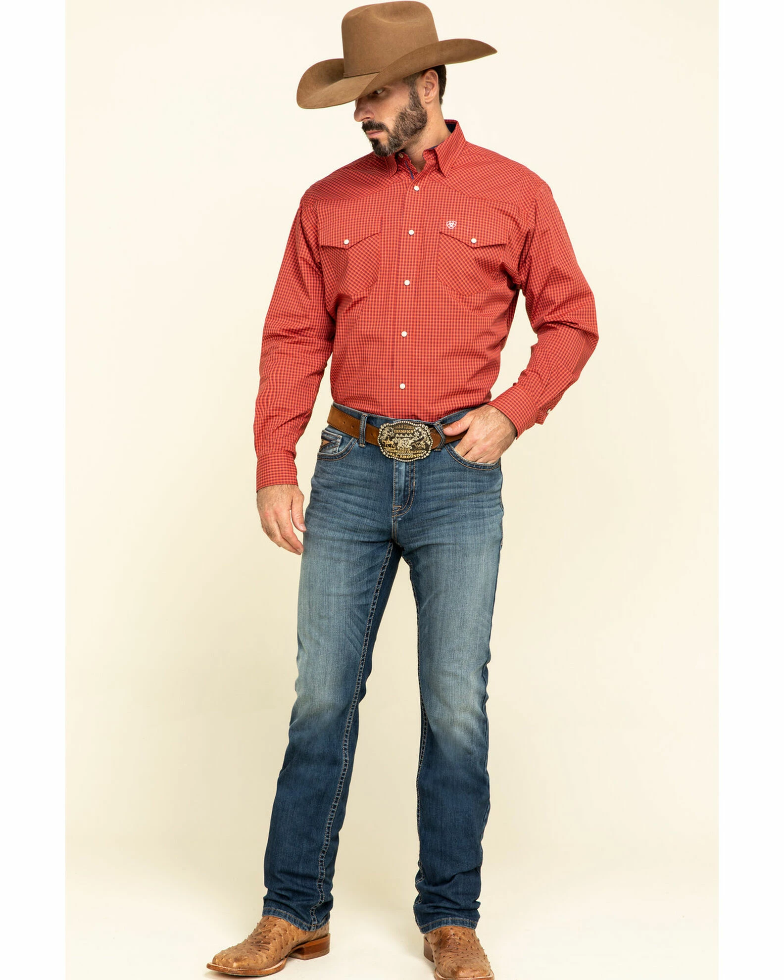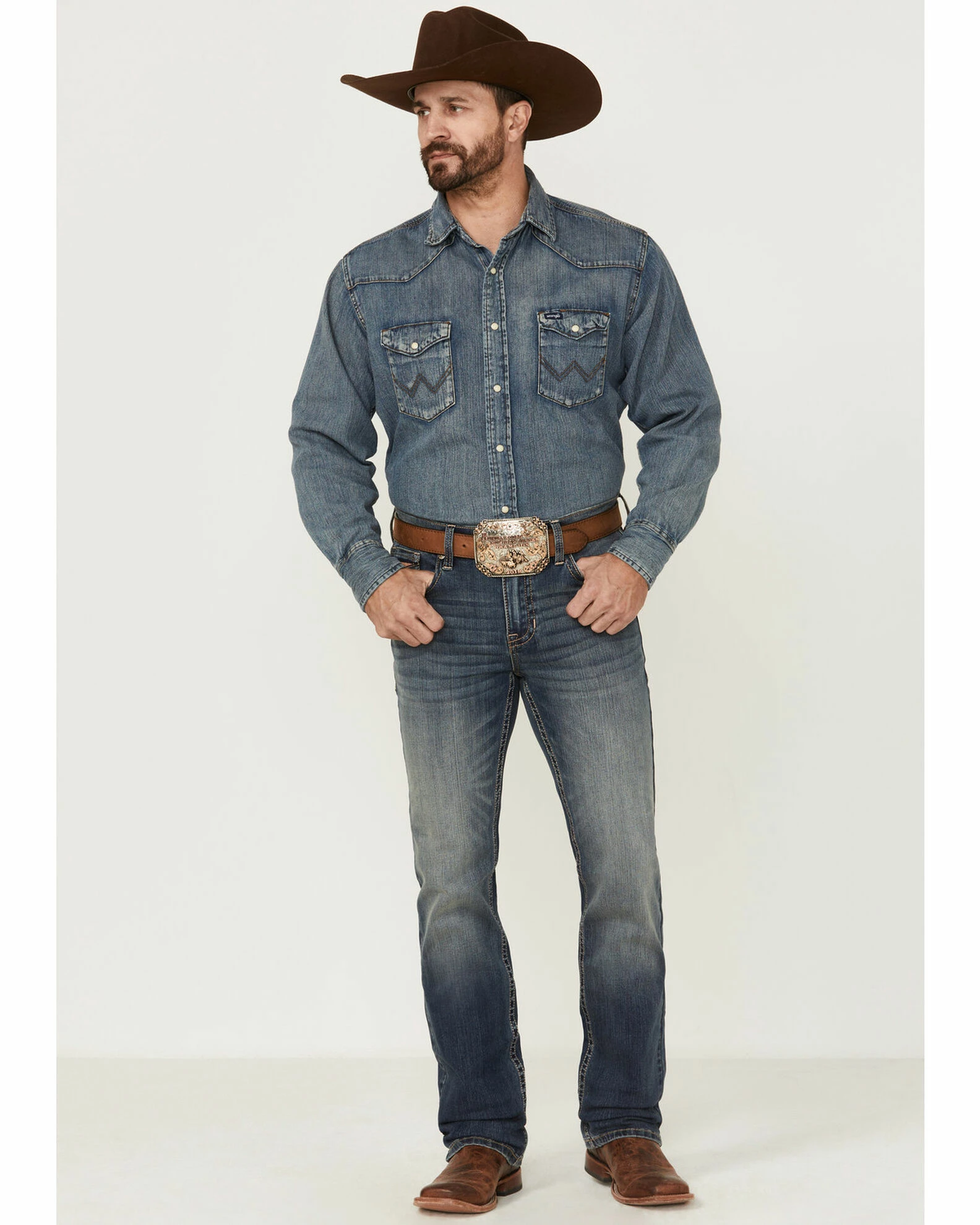 - Button-up with zip-fly